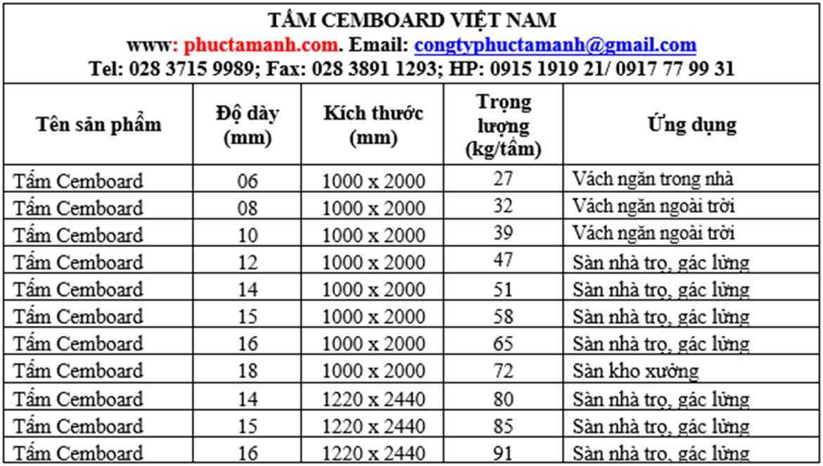 | 1 | Tấm cemboard dày 3.5mm | 115.000 |